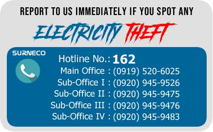 Ang kawat sa koryente dakung salang krimen basi sa "Republic Act 7832," nga adunay silot nga 12 ka tuig pagkapreso ug 20 mil pesos (P20,000.00) nga multa. Ang kadumalahan sa SURNECO adunay gimugna nga Apprehension Team nga maoy milihok binasi sa naasoy nga balaod alang sa mga malapason o naghimo ug iligal nga paggamit sa koryente sama niining mosunod: |